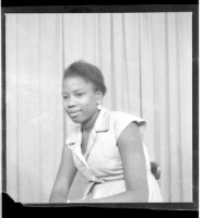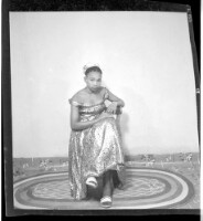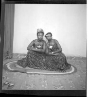 A woman wearing a dress, head wrap, and necklace sitting in profile between a man wearing a shirt sitting in profile and a little girl wearing a dress and necklace standing in profile in the studio.
