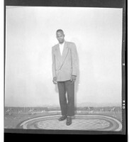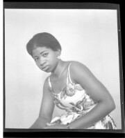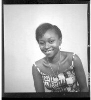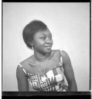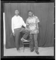 A girl wearing a dress and head wrap sitting in profile in front of two men wearing boubous standing, one face-forward and the other in profile in the studio.