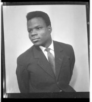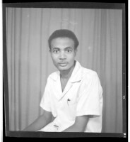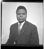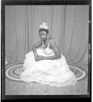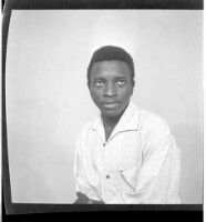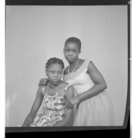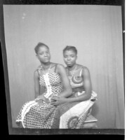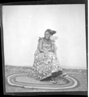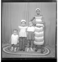A woman wearing a dress, pagne, head wrap, and necklace standing face-forward in the studio next to two little girls wearing dresses, one wearing a head wrap and pagne, both standing face-forward with a little boy wearing a t-shirt and shorts standing in