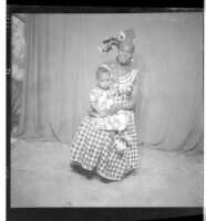 841. EAP449/2/29/841 Reference (shelfmark): EAP449/2/29/841 Title: A woman wearing a dress, head wrap, and necklace sitting face-forward holding a child on her lap in the studio. Collection Area: Endangered Archives Programme Languages: Not applicable Date Range: 2nd half od the 20th century Extent: 1 TIFF image