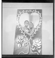 842. EAP449/2/29/842 Reference (shelfmark): EAP449/2/29/842 Title: Two girls wearing dresses and head wraps standing in profile behind a frame in the studio. Collection Area: Endangered Archives Programme Languages: Not applicable Date Range: 2nd half od the 20th century Extent: 1 TIFF image