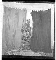 844. EAP449/2/29/844 Reference (shelfmark): EAP449/2/29/844 Title: A woman wearing a dress, pagne, and head wrap standing in profile in the studio. Collection Area: Endangered Archives Programme Languages: Not applicable Date Range: 2nd half od the 20th century Extent: 1 TIFF image