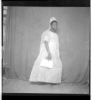 847. EAP449/2/29/847 Reference (shelfmark): EAP449/2/29/847 Title: A woman wearing a dress and head wrap holding a hand bag and standing in profile in the studio. Collection Area: Endangered Archives Programme Languages: Not applicable Date Range: 2nd half od the 20th century Extent: 1 TIFF image