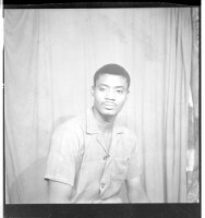 Two boys wearing shirts and pants, one wearing a tie and jacket and holding a radio, both standing in profile in a studio decorated with a sun rising on some surrounding trees.