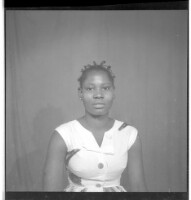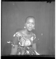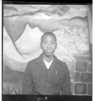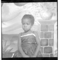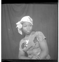A man wearing a jacket, tie, pants, and hat sitting in profile next to a woman wearing a dress, pagne, and head wrap holding a child on her lap sitting in profile in a studio decorated with clouds, flowers, and a flower pot on a little wall.