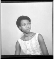906. EAP449/2/29/906 Reference (shelfmark): EAP449/2/29/906 Title: A woman wearing a dress, pagne, and necklace standing in profile in the studio. Collection Area: Endangered Archives Programme Languages: Not applicable Date Range: 2nd half od the 20th century Extent: 1 TIFF image