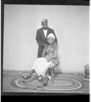 904. EAP449/2/29/904 Reference (shelfmark): EAP449/2/29/904 Title: A girl wearing a dress, pagne, head wrap, and necklace sitting face-forward in front of a man wearing a jacket, pants, and hat standing in profile in the studio. Collection Area: Endangered Archives Programme Languages: Not applicable Date Range: 2nd half od the 20th century Extent: 1 TIFF image