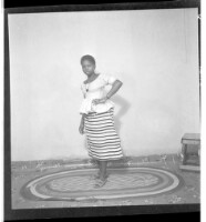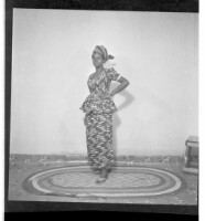905. EAP449/2/29/905 Reference (shelfmark): EAP449/2/29/905 Title: A woman wearing a dress, pagne, head wrap, and necklace standing in profile in the studio. Collection Area: Endangered Archives Programme Languages: Not applicable Date Range: 2nd half od the 20th century Extent: 1 TIFF image