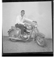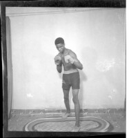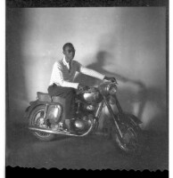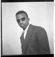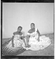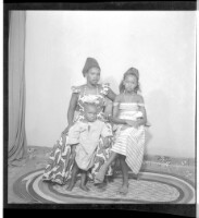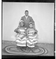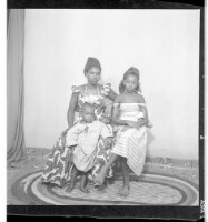 A little boy wearing a boubou standing in profile in front of a woman and a girl both wearing dresses, head wraps, and necklaces sitting, one in profile and the other face-forward' in the studio.