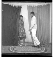 113. EAP449/2/30/113 Reference (shelfmark): EAP449/2/30/113 Title: A man wearing a shirt and pants facing a girl wearing a dress, both standing in profile in the studio. Collection Area: Endangered Archives Programme Languages: Not applicable Date Range: 2nd half od the 20th century Extent: 1 TIFF image