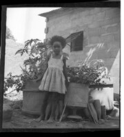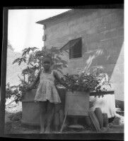 A little girl wearing a dress standing face-forward in a courtyard in front of barrels cut in half with trees in them, an open window in the background.