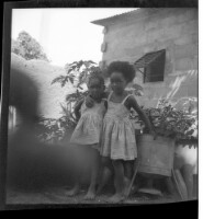Two little girls in dresses standing, one facing forward and the other in profile in a courtyard in front of barrels cut in half with trees in them, an open window in the background.