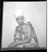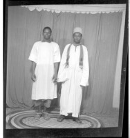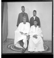 Four men wearing boubous and hats; two sitting, one face-forward and the other in profile, in front of the other two standing face-forward and in profile in the studio.