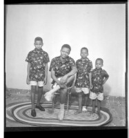 201. EAP449/2/30/201 Reference (shelfmark): EAP449/2/30/201 Title: A man wearing a shirt and shorts sitting face-forward in between three boys wearing shirts and shorts all standing face-forward in the studio. Collection Area: Endangered Archives Programme Languages: Not applicable Date Range: 2nd half od the 20th century Extent: 1 TIFF image