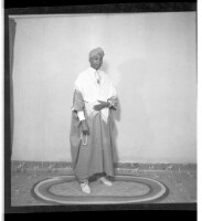 203. EAP449/2/30/203 Reference (shelfmark): EAP449/2/30/203 Title: A man wearing a shirt, tie, boubou, and scarf around his neck and head, holding prayer beads in his hand standing in profile in the studio. Collection Area: Endangered Archives Programme Languages: Not applicable Date Range: 2nd half od the 20th century Extent: 1 TIFF image