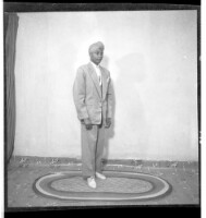 204. EAP449/2/30/204 Reference (shelfmark): EAP449/2/30/204 Title: A man wearing a suit, tie, and head wrap standing in profile in the studio. Collection Area: Endangered Archives Programme Languages: Not applicable Date Range: 2nd half od the 20th century Extent: 1 TIFF image