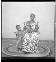 210. EAP449/2/30/210 Reference (shelfmark): EAP449/2/30/210 Title: A woman wearing a dress, head wrap, and necklace holding a little girl on her lap sitting face-forward with another little girl wearing a dress and amulets around her neck standing in profile by her side in the studio. Collection Area: Endangered Archives Programme Languages: Not applicable Date Range: 2nd half od the 20th century Extent: 1 TIFF image