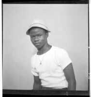 236. EAP449/2/30/236 Reference (shelfmark): EAP449/2/30/236 Title: A man wearing a t-shirt, hat, and necklace sitting face-forward in the studio. Collection Area: Endangered Archives Programme Languages: Not applicable Date Range: 2nd half od the 20th century Extent: 1 TIFF image