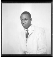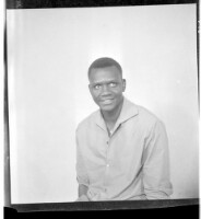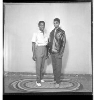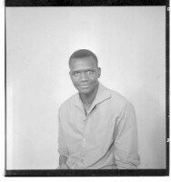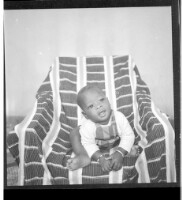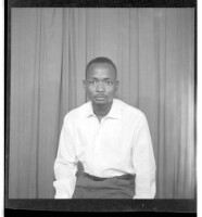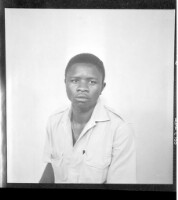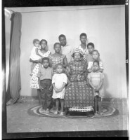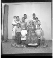A woman wearing a dress and head wrap sitting face-forward amongst six children, four little girls wearing dresses and two little boys wearing shirts all standing face-forward in front of two men wearing shirts and a girl wearing a dress, head wrap, and n