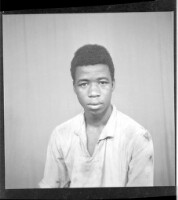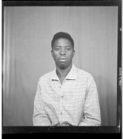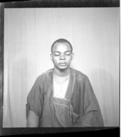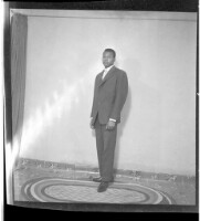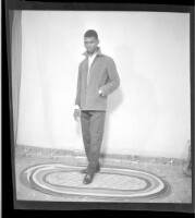 Two men wearing jackets, one wearing a hat and pants holding a little boy on his lap and the other wearing large pants, both sitting, one face-forward and one in profile, in the studio.