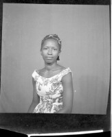 A man wearing a t-shirt and pants crouching in profile in front of 4 girls, 3 of whom are wearing dresses and the other wearing a skirt and shirt, all standing in profile in the studio.