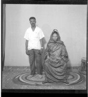 363. EAP449/2/30/363 Reference (shelfmark): EAP449/2/30/363 Title: A man wearing a shirt and pants standing face-forward next to a woman wearing a dress and covered in a large wrap sitting in profile in the studio. Collection Area: Endangered Archives Programme Languages: Not applicable Date Range: 2nd half od the 20th century Extent: 1 TIFF image