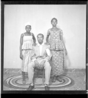 364. EAP449/2/30/364 Reference (shelfmark): EAP449/2/30/364 Title: A man wearing a suit sitting face-forward in between two girls wearing dresses, pagnes, and head wraps standing face-forward in the studio. Collection Area: Endangered Archives Programme Languages: Not applicable Date Range: 2nd half od the 20th century Extent: 1 TIFF image