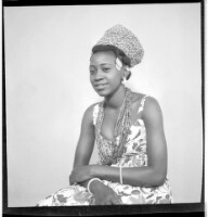 391. EAP449/2/30/391 Reference (shelfmark): EAP449/2/30/391 Title: A girl wearing a dress, head wrap, and necklace sitting in profile in the studio. Collection Area: Endangered Archives Programme Languages: Not applicable Date Range: 2nd half od the 20th century Extent: 1 TIFF image