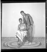 395. EAP449/2/30/395 Reference (shelfmark): EAP449/2/30/395 Title: A man wearing a shirt, jacket, and pants standing in profile with his arm around a girl wearing a dress, pagne, and glasses sitting face-forward in the studio. Collection Area: Endangered Archives Programme Languages: Not applicable Date Range: 2nd half od the 20th century Extent: 1 TIFF image