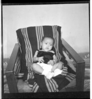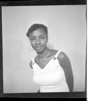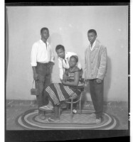 A girl wearing a dress, pagne, and necklace sitting in profile between three men wearing shirts, one holding a camera, one of whom is crouching in profile with the other two standing face-forward in the studio.