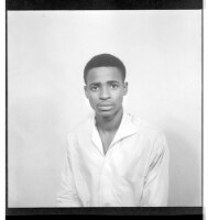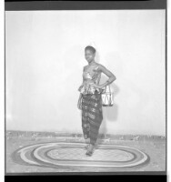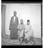 A man wearing a boubou and hat standing face-forward next to two men, one wearing a shirt, hat, and large pants, and the other wearing a boubou and hat, both sitting face-forward in the studio.