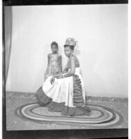 411. EAP449/2/30/411 Reference (shelfmark): EAP449/2/30/411 Title: A woman wearing a dress, head wrap, and necklace sitting in profile in front of a little girl wearing a dress standing face-forward in the studio. Collection Area: Endangered Archives Programme Languages: Not applicable Date Range: 2nd half od the 20th century Extent: 1 TIFF image