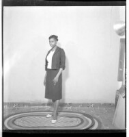 413. EAP449/2/30/413 Reference (shelfmark): EAP449/2/30/413 Title: A girl wearing a shirt, skirt, and necklace standing in profile in the studio. Collection Area: Endangered Archives Programme Languages: Not applicable Date Range: 2nd half od the 20th century Extent: 1 TIFF image