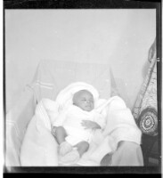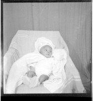 443. EAP449/2/30/443 Reference (shelfmark): EAP449/2/30/443 Title: A baby wearing overalls covered with a towel laying in profile on a chair in the studio. Collection Area: Endangered Archives Programme Languages: Not applicable Date Range: 2nd half od the 20th century Extent: 1 TIFF image