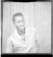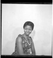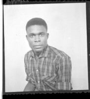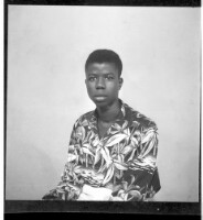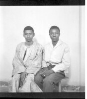 A woman wearing a dress and head wrap holding a child on her lap sitting face-forward in between two men, one wearing a boubou, heat, and neck scarf and the other wearing a shirt, shorts, and a hat with a little boy wearing a shirt, pants, and a hat, all