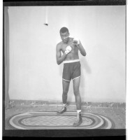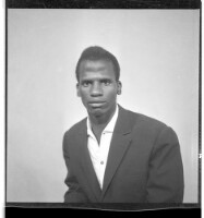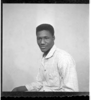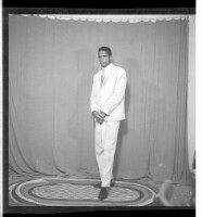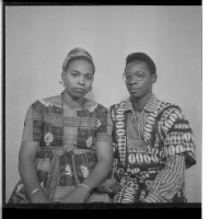A girl wearing a dress, head wrap, and necklace standing face-forward posing with her foot on a chair - next to her we can see a bowl on a basket - taken in front of a wall with a window.