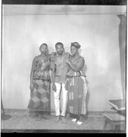 110. EAP449/2/31/110 Reference (shelfmark): EAP449/2/31/110 Title: A man wearing a shirt and pants standing face-forward in between two women wearing dress, pagnes, and head wraps standing in profile in the studio. Collection Area: Endangered Archives Programme Languages: Not applicable Date Range: 2nd half od the 20th century Extent: 1 TIFF image