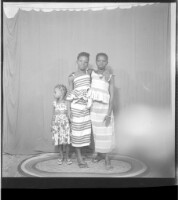 129. EAP449/2/31/129 Reference (shelfmark): EAP449/2/31/129 Title: Three girls wearing dresses and pagnes all standing, one in profile and two face-forward in the studio. Collection Area: Endangered Archives Programme Languages: Not applicable Date Range: 2nd half od the 20th century Extent: 1 TIFF image
