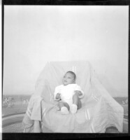133. EAP449/2/31/133 Reference (shelfmark): EAP449/2/31/133 Title: A baby wearing undergarments sitting in profile on a chair in the studio. Collection Area: Endangered Archives Programme Languages: Not applicable Date Range: 2nd half od the 20th century Extent: 1 TIFF image
