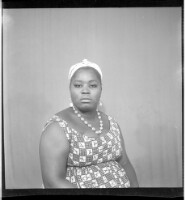155. EAP449/2/31/155 Reference (shelfmark): EAP449/2/31/155 Title: A woman wearing a dress, head wrap, and necklace sitting face-forward in the studio. Collection Area: Endangered Archives Programme Languages: Not applicable Date Range: 2nd half od the 20th century Extent: 1 TIFF image