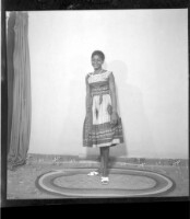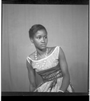 163. EAP449/2/31/163 Reference (shelfmark): EAP449/2/31/163 Title: A girl wearing a dress and necklace standing in profile in the studio. Collection Area: Endangered Archives Programme Languages: Not applicable Date Range: 2nd half od the 20th century Extent: 1 TIFF image