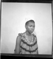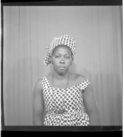 221. EAP449/2/31/221 Reference (shelfmark): EAP449/2/31/221 Title: A woman wearing a dress, head wrap, and necklace sitting face-forward in the studio. Collection Area: Endangered Archives Programme Languages: Not applicable Date Range: 2nd half od the 20th century Extent: 1 TIFF image