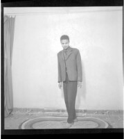 230. EAP449/2/31/230 Reference (shelfmark): EAP449/2/31/230 Title: A man wearing a suit and tie standing face-forward in the studio. Collection Area: Endangered Archives Programme Languages: Not applicable Date Range: 2nd half od the 20th century Extent: 1 TIFF image