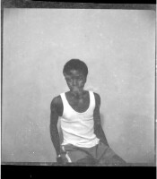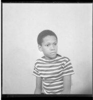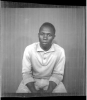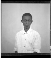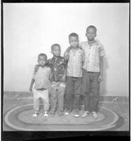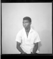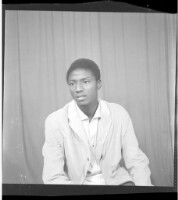 A woman wearing a dress, head wrap, and necklace sitting in profile in front of two men wearing suits and ties, both standing in profile in the studio.
