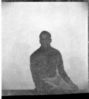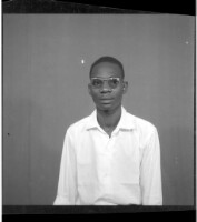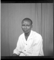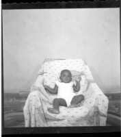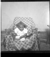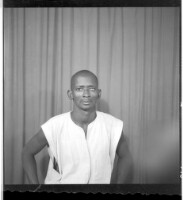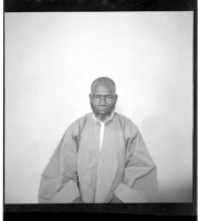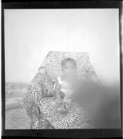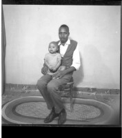 A woman wearing a dress, pagne, and head wrap holding a little girl on her lap while sitting face-forward between a man wearing a shirt and large pants and another woman wearing a dress, pagne, head wrap, and necklace, all standing face-forward in the stu