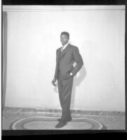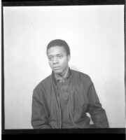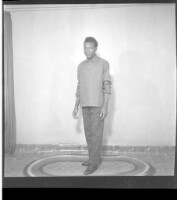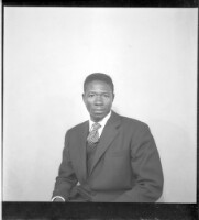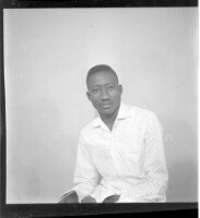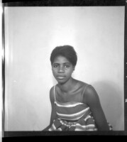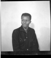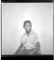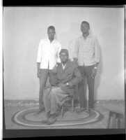 A woman wearing a dress, pagne, and head wrap holding a baby on her lap next to a man wearing a shirt and pants, both sitting face-forward in between two boys wearing shirts and shorts and two girls wearing dresses, all standing face-forward in the studio