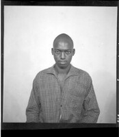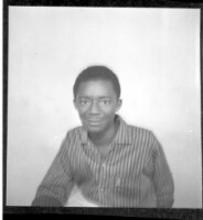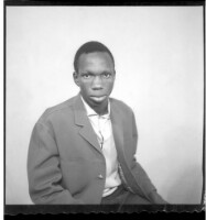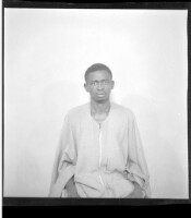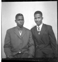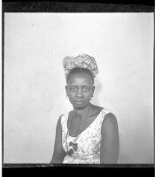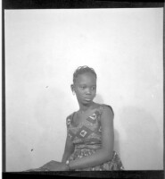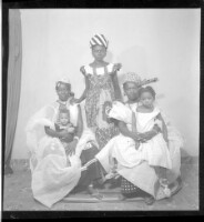 Two women wearing dresses, head wraps, and necklaces each holding a little girl on their lap while sitting face-forward in front of another woman wearing a dress and necklaces standing face-forward in the studio.