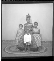 353. EAP449/2/31/353 Reference (shelfmark): EAP449/2/31/353 Title: A woman wearing a dress, head wrap, and necklace sitting face-forward holding a child on her lap; she is between two little girls wearing dresses standing face-forward in the studio. Collection Area: Endangered Archives Programme Languages: Not applicable Date Range: 2nd half od the 20th century Extent: 1 TIFF image