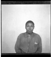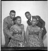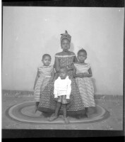 A woman wearing a dress, head wrap, and necklace sitting face-forward holding a child on her lap; she is between two little girls wearing dresses standing face-forward in the studio.