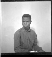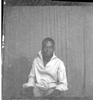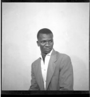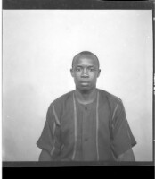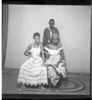 Two women wearing dresses and head wraps both sitting, one face-forward and the other in profile in front of a man wearing a boubou standing face-forward in the studio.